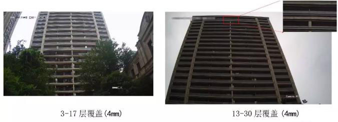 在住宅楼层高达 100 米时,需采用两个摄像机上下组合正对住宅楼,中间楼层建议重叠监控,实际安装如下图所示 。