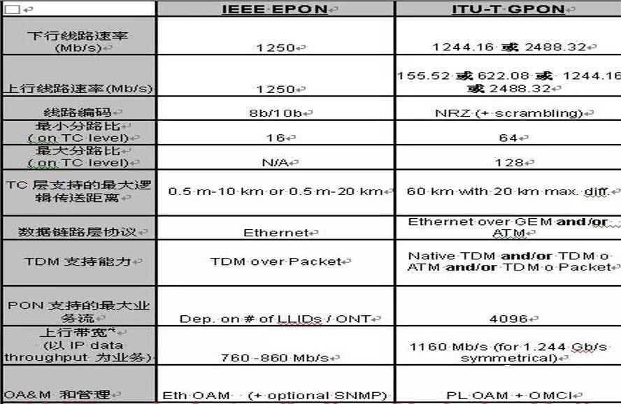 针对GPON和EPON技术的不同特点,可以对这两种技术做出以下分析。