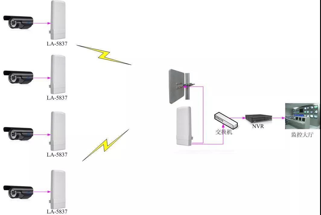 2、为了避免无线干扰,大部分的无线网桥采用了5G频段进行连接,干扰更少,接入速率更高,时延低,网速稳定,可以满足视频监控的传输需求;两个网桥分别连接两端的设备,实现网络信号的传输,连接方式如下图所示。