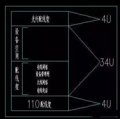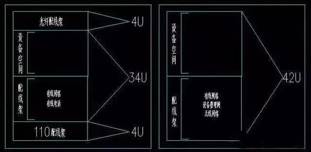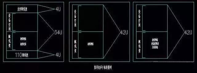 其中最上方的4U空间为光纤配线架专用,最下方的4U为110配线架专用,这两种配线架排布和打接时均按由上至下的先后顺序排列(如个别机柜中没有该类配线架则空间预留,不得占用);