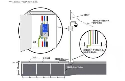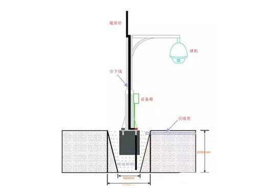 摄像机均安装在立杆上,如现场土壤情况较好(石沙等不导电物质较少)的情况下,可以利用立杆直接接地,地坑尺寸在2000×1000×600mm,底部细土或潮湿的土壤比例达到85%,其内填筑细土,再垂直埋入一根1500mm×12mm的钢筋,浇注混凝土,到达地表时,嵌入固定螺栓(按照立杆基座尺寸固定),其中一根螺栓可与钢筋焊接,作为接地极使用。等混凝土完全稳定后,在其周围回填细土并保证一定的潮湿。最后把摄像机与防雷器的地线直接焊接在立杆上的接地极上即可。做好防锈处理,及标示铭牌。