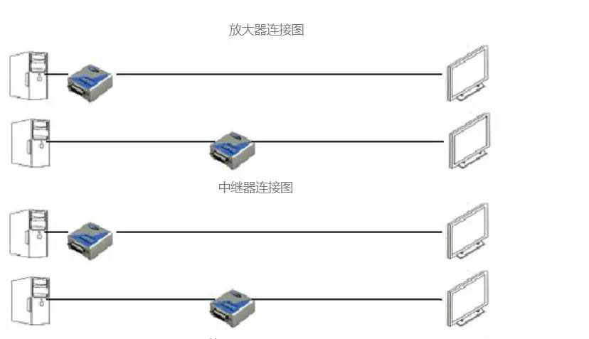 如果传输距离在30米左右。可以使用信号放大器或者中继器。这两个的区别在于:放大器放在DVI电缆的前端,通过一根电缆放大传输信号;中继器顾名思义是放置在两条DVI电缆的中间起到转发信号的功能。从传输距离和支持的分辨率以及造价方面来比较,两种设备基本差不多,只是根据用户不同的需求进行选择,所以我们把它们归在同一类。通常信号放大器和中继器可以有效传输1920x1200的信号到15米,传输1280x1024的DVI信号到30米,使用一般的DVI电缆就可以了。这两种的设备适用于中短距离传输。优点:小巧、方便,造价相对较低。缺点:不适合长距离传输。