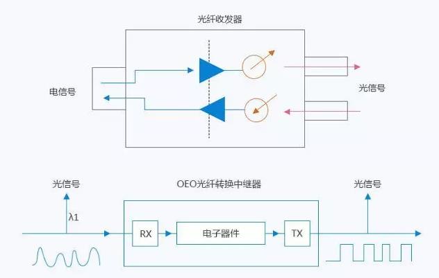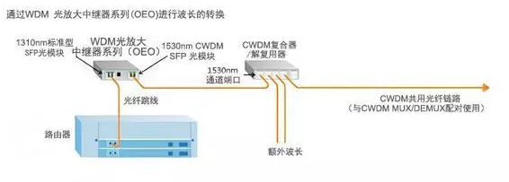 WDM 光放大中继器系列(OEO)的最大特点是能在不改变数据/信号内容的前提下,通过不同的波长对信号进行接收、放大和重新发射。如今,波长的转换只能通过WDM 光放大中继器系列(OEO)来实现。WDM光放大中继器系列(OEO)像再生器一样工作,将光输入信号转换为电信号,通过一个新的电脉冲振幅和波形,生成一个输入信号的逻辑副本,并利用这一电信号驱动发射器产生出一个具有新的波长的光信号。