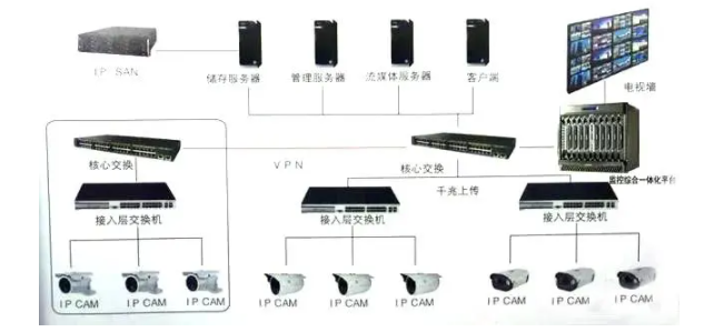 拓扑图二值得说的是,对于大型监控,nvr的存储方式已经不能满足,存储的话可能会用到ip-san存储,这个在前面我们曾经提到过。