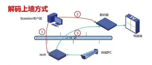 对于小型监控项目,使用解码器上墙是比较简单方便的。有的解码器支持“轮巡解码”,可以将解码器的功能发挥到最大。目前知名的摄像机品牌生产商基本上都是搭配自己的解码器,解码能力与其它品牌的摄像机无法兼容,如果从前端的拍摄到后端的解码都是一个品牌,那么容易就可以实现,如果用户前端有多个品牌的监控,那么就不能兼容。关于它的应用,我们看它的拓扑图: