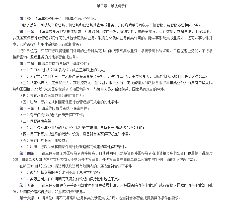 涉密集成资质是保密行政管理部门许可企业事业单位从事涉密信息系统集成业务的法定资格。申请单位申请不同等级和业务种类的涉密集成资质,应当符合涉密集成资质具体条件的要求。涉密资质的申请应当包括以下条件:
