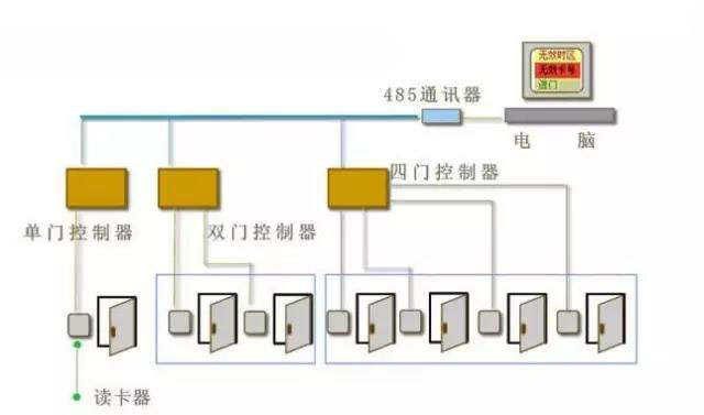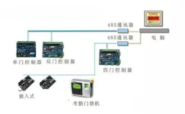 使用到485控制器,读卡器,转换器,锁,电源等,多种485型号门禁控制器联网,通过多个485总线连接电脑,优秀的通信,工作性能。