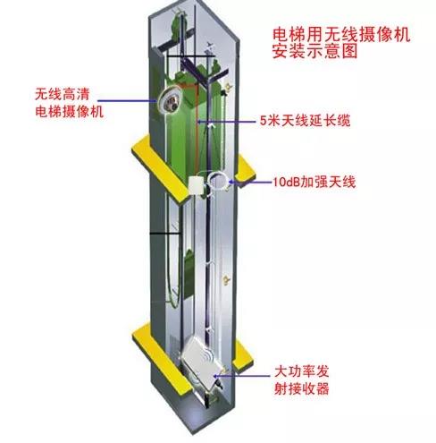 前端将网桥发射端固定于电梯轿厢顶部,电梯内的视频信号通过网线传到轿厢顶部的发射端网桥;在电梯井顶部安装接收端无线网桥,然后接入后端存储设备即可完成整个电梯监控系统。