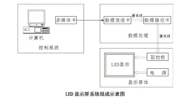 LED显示屏系统由三大部分组成:显示屏体、数据处理和控制计算机。各部分示意图如下: