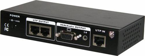 髙清双绞线VGA视音频接收器UTP801AR要与髙清双绞线VGA视频发射器配合使用,传输距离为300米。UTP801AR一般是安放在显示端,显示设备的VGA信号线和音频信号线直接连接在接收器的对应端子上。