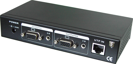 该单路VGA信号中继器,包含单路VGA视频和音频输出,同时还额外地增加了2个发送端口(RJ45端口)供中继使用。本地的输出VGA接口供给本地的显示设备使用,2个发送端口(RJ45端口)与两台单路接收器UTP801AR配合传输供给附近的其他显示设备使用。