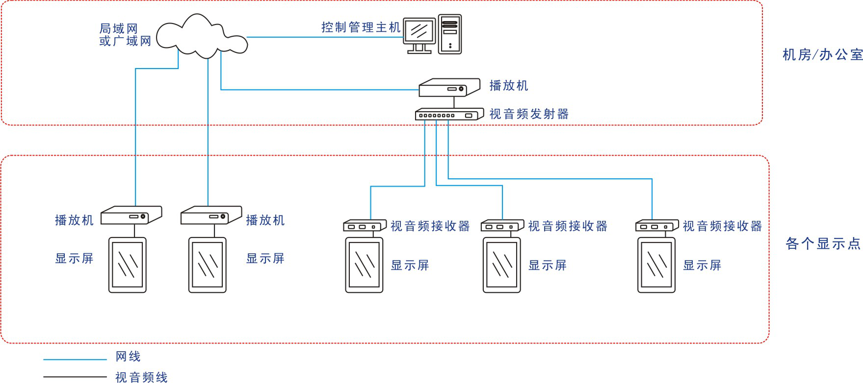 机房设置媒体播放器XX台,用于接收管理控制主机发送的多媒体信息,并与视音频传输器组成广播式的信息发布。