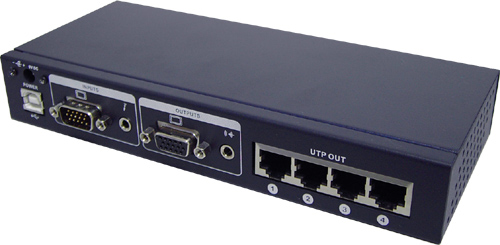 UTP804AT有一组VGA信号+音频信号输入口,一组VGA信号+音频信号本地输出口,以及4个RJ45的输出口,因此UTP804AT既可以支持本地信号显示,又可以将4路高清信号经过4个RJ45端口通过4根非屏蔽超5类网线传输到300米的地方。UTP808AT可以由标配的电源适配器供电,也可以选用USB供电。