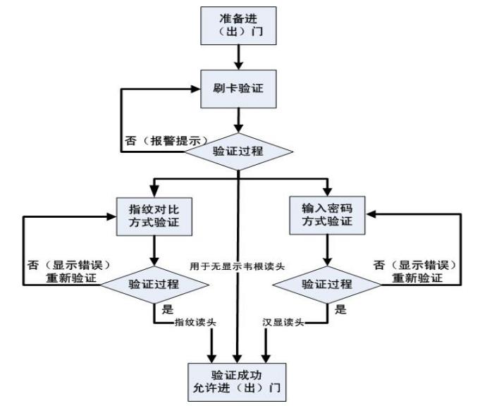 持卡者在出入口读卡器上读卡,如卡有效,控制器会打开电子锁,如果该卡不被允许,读卡器和控制器均会报警,以提示管理人员,同时电子锁将不会打开。