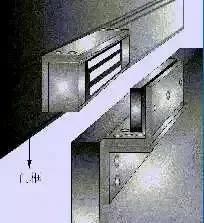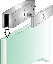 没有包框的玻璃门需要有配件来辅助安装。安装方法与普通门的表面安装方法基本雷同,只不过是在第三步安装继铁板的时候不同,安装方法如图九所示。 把U型槽连同橡胶缓冲垫及不锈钢垫片(放在锁螺丝的一边)套在玻璃门上,用无头内六角螺丝锁在玻璃门上,然后把继铁板固定在U型槽上。对于不同的玻璃门厚度及不同型号的电磁锁,我们提供不同型号的U支架。