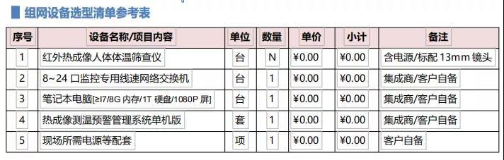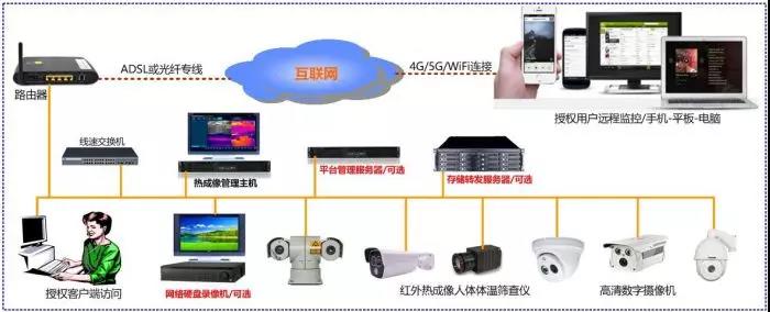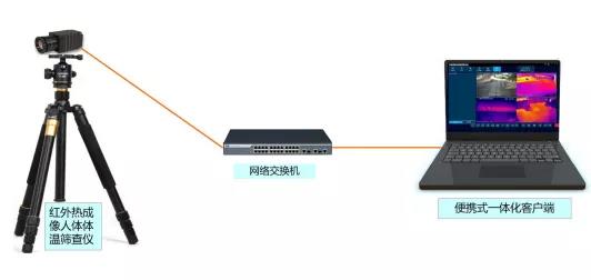 系统采用极简模式设计,由红外热成像体温筛查仪、网络交换机、便携式一体化客户端构成。系统以专用红外热成像体温筛查仪为主要前端数据采集设备工具。该前端专门针对人体测温区 间进行精确校准,能够适应人体健康检查的各种应用环境,能够有效针对人体温度分布区间进行高精 度温度识别,特别适用于各类人员聚集区域、公共场所的人员健康情况管理。移动快速布置方式以固定式人体测温型红外热像仪为基础,通过增加折叠支架、三脚架的模式, 实现工具化应用扩展,满足监管人员对特殊对象的针对性检测及多场景灵活性应用需求。