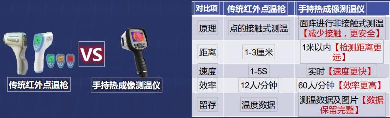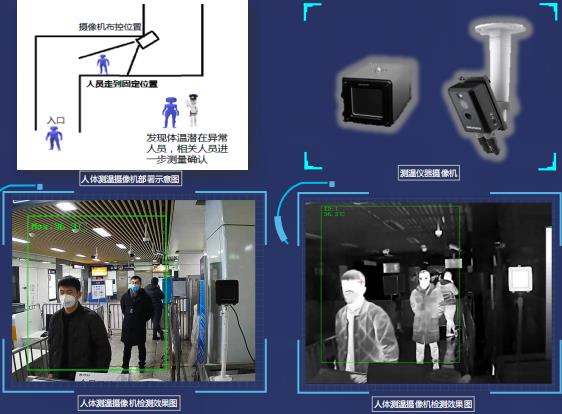 热成像体温检测技术:检测人体表面的热辐射进行测温,通过热像仪(非接触式方)初步对多个人体表面温度进行快速检测,可在各种场景下快速部署。