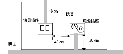 所有信息接口﹙插座﹚均采用RJ45模块, RJ45埋入式信息插座与其旁边电源插座应保持0.4m的距离,公共场所的信息接口﹙插座﹚下沿距地0.3m嵌墙暗装。所有线路均在线槽、楼板内、墙内及吊顶内等处暗敷设。