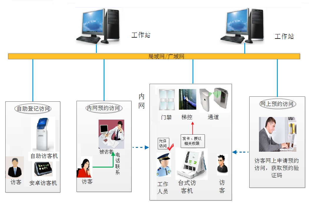内部人员通过内网登录访客管理平台进行预约,访客亦可通过被访人提供的预约登记平台网上预约登记。