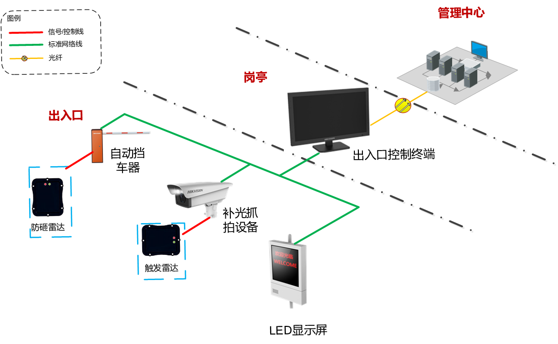 出入口控制系统由前端子系统、传输子系统、中心子系统组成,实现对车辆的24小时全天候监控覆盖,记录所有通行车辆,自动抓拍、记录、传输和处理,同时系统还能完成车牌、车主信息管理等功能。