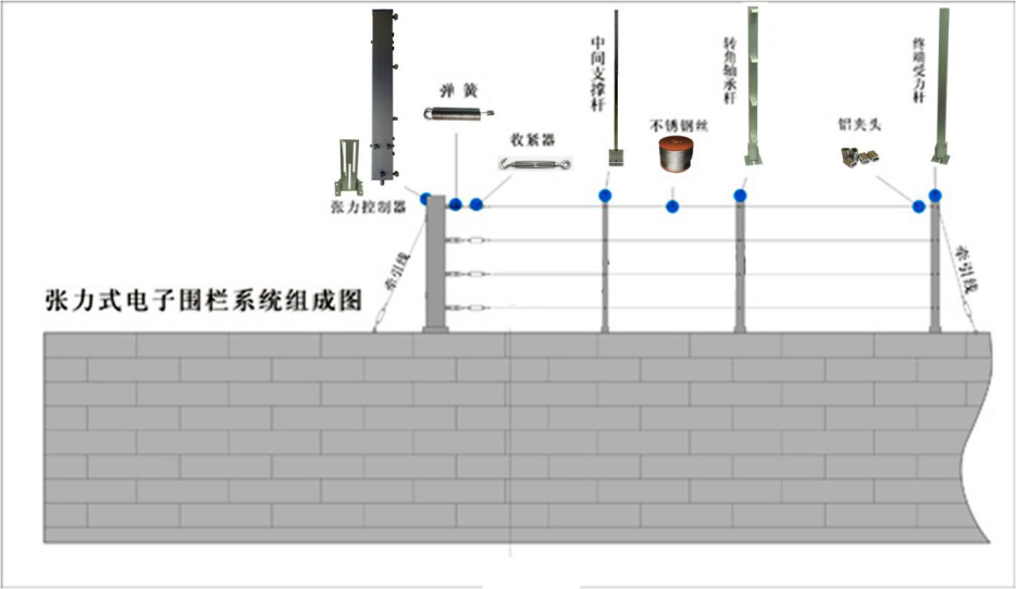 张力式智能电子围栏是由张力传感器、防区控制器、控制杆、受力杆、支撑杆、多道规则钢绳等组成的有形围栏系统,为周界围墙构筑了一道有形的防范实体,它采用了全新的张力探测方式及特殊的电信号处理方式,目前,是国内最安全、最可靠的外围入侵防范系统之一。
