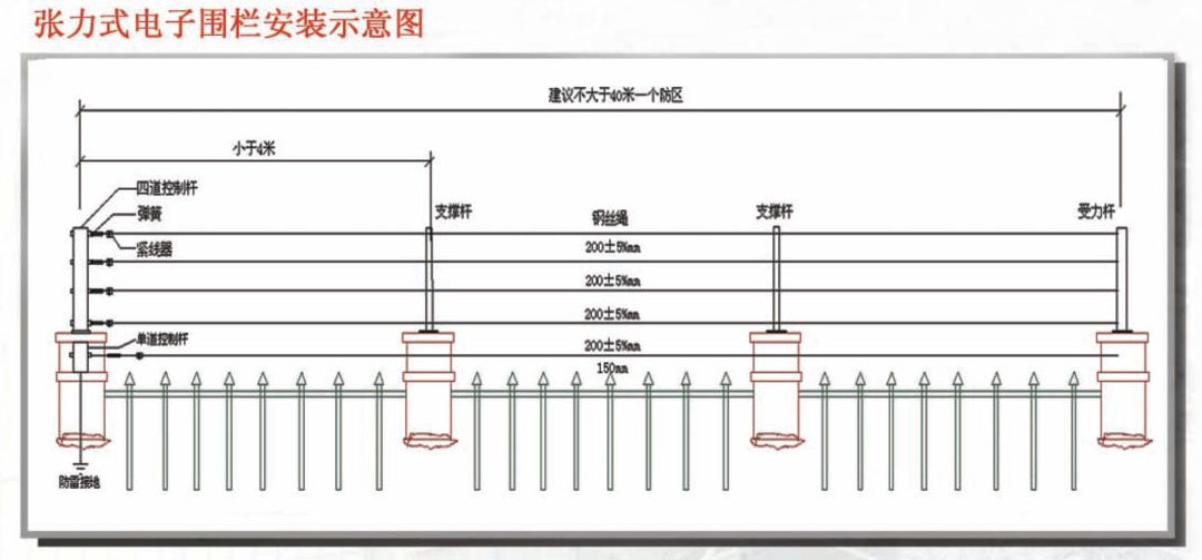 周界总长约800米为,根据市公安局的有关规定:防区划分的距离应不大于40米,每隔3-5米安装一根支撑杆,在拐弯处应安装受力杆,采用附属式安装时,围栏的高度应不低于750mm,最下一道钢绳与实体周界上端的水平距离应在130mm-150mm之间,相邻两根钢绳的间距为200mm±10mm。