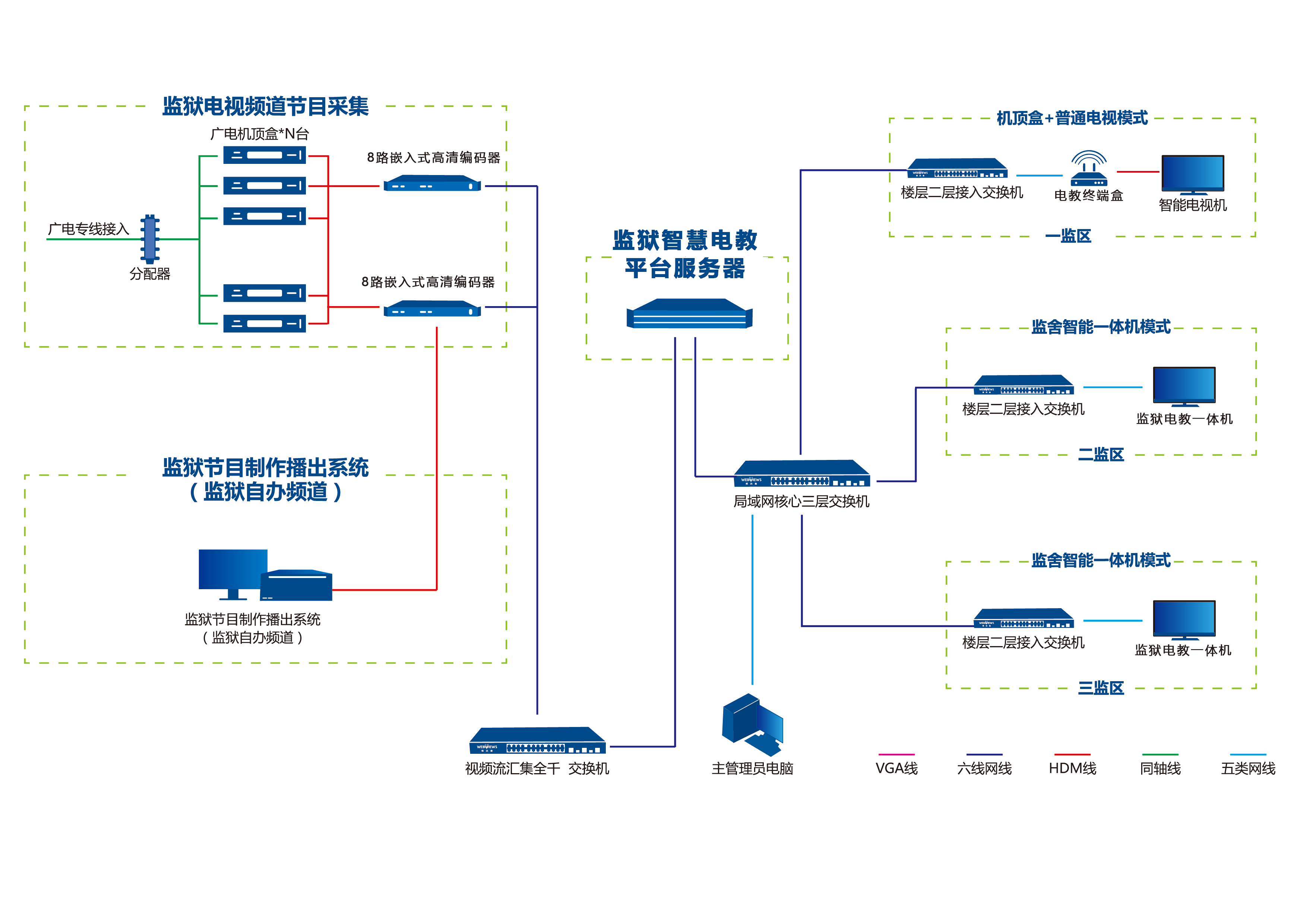 5、高速IP网络:传送IP流量进行数字内容分发所需要的高速宽带网络,对监狱而言,可利用监狱原有局域网络或新部署局域网络,而无需另外部署数字电视同轴网络。