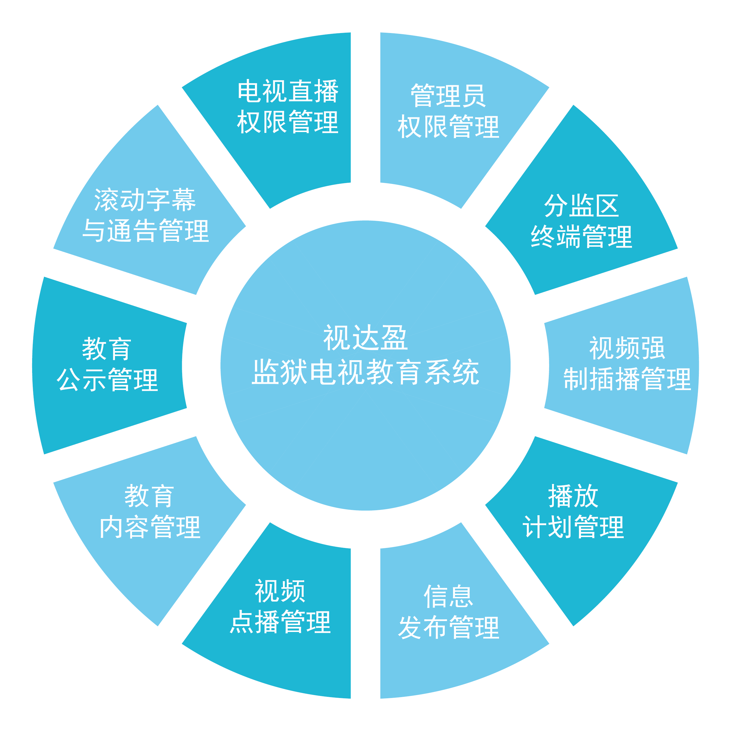 监狱数字电视教育系统依靠电视终端,为服刑人员提供教育视频点播、及时的信息通告、强制插播和播放日志追踪、电视教育等功能。将一些讲座或者电视频道节目录制成教学视频,导入数字电视教育系统,服刑人员可以随时观看教育讲座;提供强制插播功能,监狱管理人员可以强制控制服刑人员的电视终端播放特定的教育视频,一定程度上保证了教育质量;同时,提供日志追踪功能,管理人员可以查看到每个房间、在什么时间、观看哪些视频节目,对服刑人员的电视终端,做到全局的掌控。功能如下图: