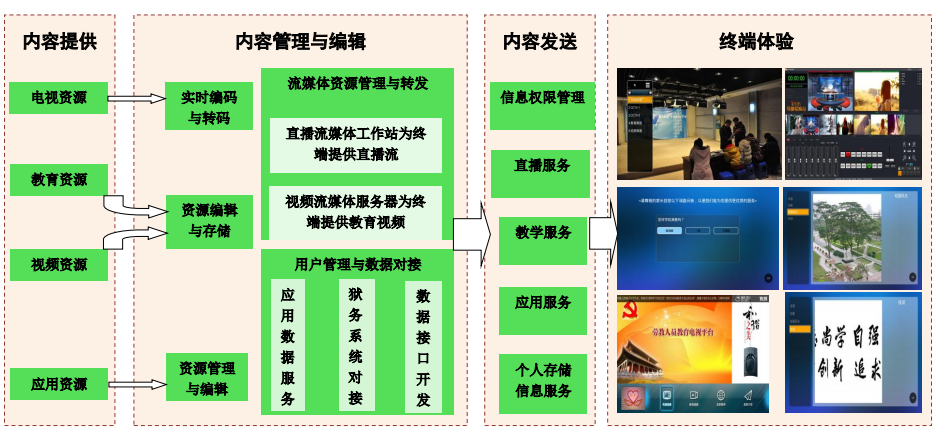 在这里,如果是进行简单的教育信息浏览,系统中间件EPG服务器将直接提供该服务,流媒体平台服务主要提供教育点播和直播时移电视服务,编码器/接收机则提供直播电视节目采集服务。
