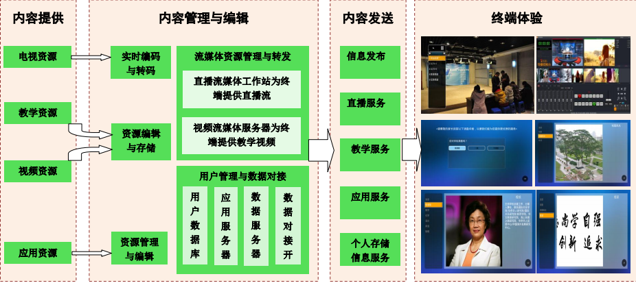智慧校园融合视频讯息教学系统和传统电视教学相比,现代化的视频讯息教学系统最大特别是可以满足更多的个性化需求,比如强制插播、分组管理、信息推送、视频教学类别管理、视频录播、后台统计、终端日志管理、控制每台电视开关机、电视回看等等,更好地适应智能信息化教学。