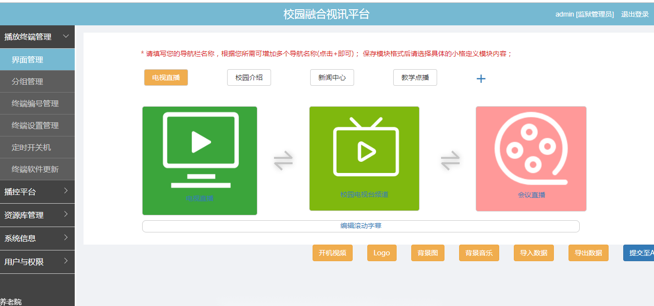 1播放终端界面管理:可以通过管理后台自定义播放终端的界面呈现样式及功能模块。界面管理部分包括欢迎页内容、主界面导航栏、功能框样式、功能框内容、滚动字幕添加及编辑、界面LOGO添加、背景图片添加及编辑、背景音乐添加编辑等;
