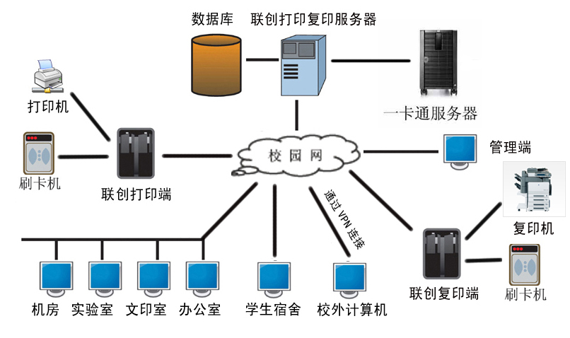 2、打印、复印和扫描完全实现自助式无人化管理,师生可凭借校园卡自己进行复印和打印。