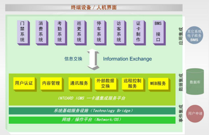 统一信息平台由ICMS (Integrated Card Multipue-use System)智能卡集成平台: 该平台有中心主机、系统集成管理平台软件两部分构成,其中各级子系统由公共模块(人员信息、卡片资料等)和特色模块(各子系统独立管理各自下属硬件部分)两部分组成,数据库由公共数据库和特色数据库构成。使各级通过统一操作系统与数据库为系统建立了完整、统一的系统运行平台,使得各子系统在管理上、数据存储和使用等方面形成集中管理与调度。