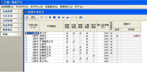 根据一卡通系统服务对象的不同,进行卡种类定义,如管理卡、员工卡、临时卡、访客卡等。