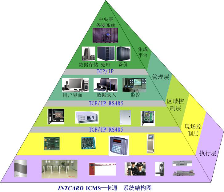 整个系统网络共分为五级结构:第一级结构是核心的中央服务器系统和集成平台;第二级结构由TCP/IP协议的以太网构成的一卡通系统管理层,即各系统工作站;第三级结构是由TCP/IP协议的以太网构成的区域控制层(小型一卡通系统可省略,管理层与现场控制层直联);第四级结构是由TCP/IP协议的以太网或工业总线协议RS485构成的现场控制层;第五级结构是由现场终端设备组成的执行层。