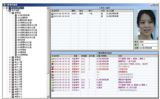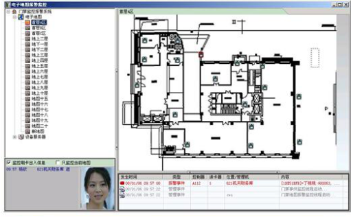 管理主机可实时监视所有门禁点电锁的开/关,以多级电子地图、表格方式实时显示所有门禁点的开关状态,并可详细查看每次开门的时间、日期、进出人员的卡号、姓名、隶属部门、职务、个人肖像等资料。可对单门、部分或全部门锁进行中央开/关控制。