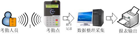 系统由考勤机(门禁读卡器、独立考勤机等)、通讯模块、管理计算机及考勤管理软件组成。系统具备自动存储交易记录、下载黑名单等功能,工作于脱网或联网方式。
