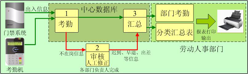 由于系统采用统一的管理平台,所有数据都存储在中心数据库。因此考勤信息的处理与汇总就非常简单。信息的处理流程如下图所示: