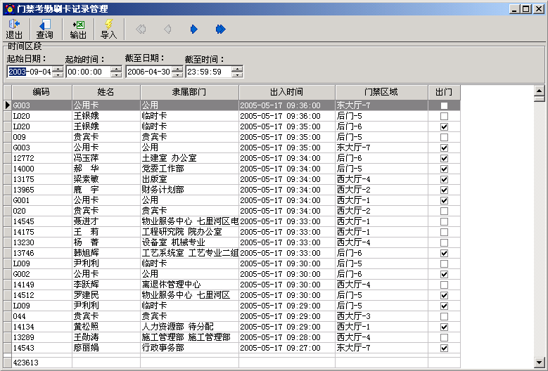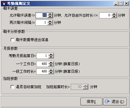 考勤主要是为了考核员工上下班、不同倒班的出勤情况,而门禁管理的进出数据库部分详细记录了每位员工的进出时间;因此,根据考勤制度(班次、上下班时间及旷假规定等)对所有的进出记录进行的、计算、统计、分类,即可产生每个员工的出勤情况,从而完成考勤功能。因此,在没有独立考勤机的地方,且需考勤,可以指定此处的门禁系统读卡器作为考勤数据的采集点,所以说考勤部分主要是由软件完成,首先用户设置好人事资料、班次、出勤时间、假日等,然后通过对人员进出资料(刷卡记录)进行分类、计算、统计、汇总后,生成人事出勤报表由电脑或打印机输出。