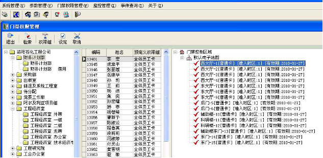 通过发卡中心的卡类、以及区域、时间区的预先编程设置,系统能对持卡人的通行卡进行有效性授权(进/出等级设置),设置卡的有效使用时间和范围(允许进入的区域)。