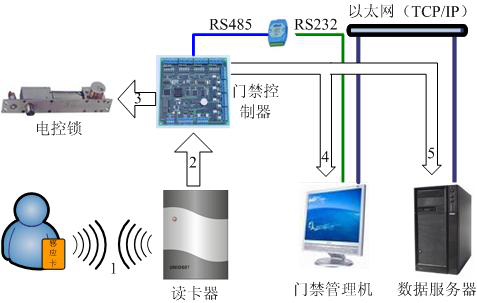门禁系统由控制主机、身份识别设备和电锁组成(联网时外加电脑和通讯转换器),身份识别方式可以是读卡器、密码键盘、指纹识别仪等,验证后将信号发送到主机,主机进行检查其合法性,然后决定是否进行开门动作。整个过程只要在有效的信息均可实现门禁管理功能。设备安装门边墙内外,而不影响其工作。门禁系统的全部数据集中存放在中心服务器中。