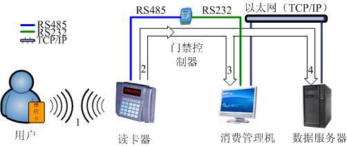 持卡人在发卡中心领卡、到充值点交款充值后,既可在窗口收费机上消费,窗口收费机暂存交易流水并实时上传给管理PC机,形成管理所需信息,交易记录存贮在服务器上确保数据安全。
