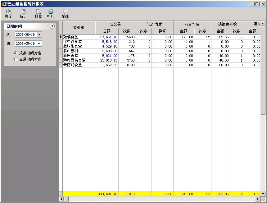 提供POS机,营业组,餐次的日、月、年报表和总交易报表等