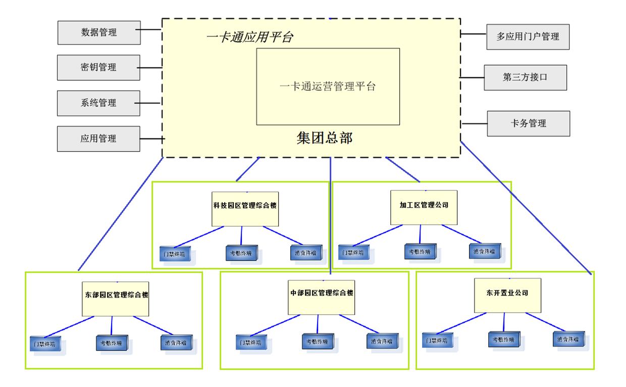 根据项目需求,根据IC卡多应用的特点,构建一套基于B/S架构的以IC卡为介质,支持商户消费、门禁、食堂售饭等功能的企业一卡通集中管理平台。建立的统一的、集约化的一卡通管理平台,实现客户数据、账户数据、交易数据和公共功能模块的统一管理。