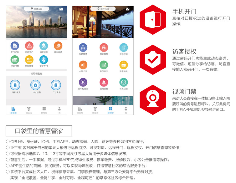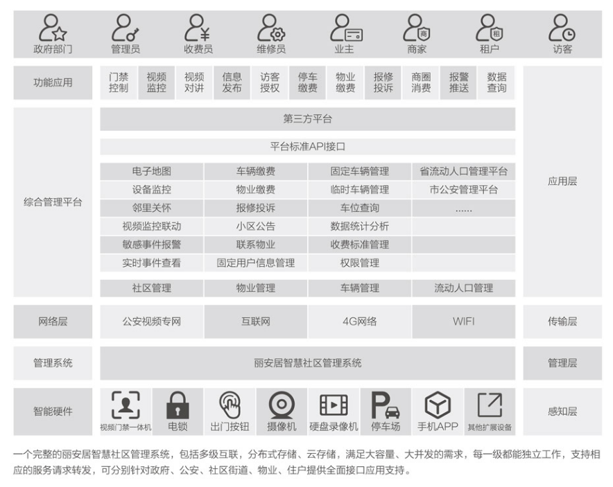 仲子路智慧社区解决方案是专门针对构建智慧城市、智慧社区而量身定制。丽安居系统在满足“群众性治安防控”目标下,以业主/租户体验为核心,以社区生活为场景,利用互联网、物联网、大数据、人工智能等技术,实现人、车、设备的互联、互通、开放、共享,为社区居民和社区物业带来一个全新的、数字化的智能综合管理系统。