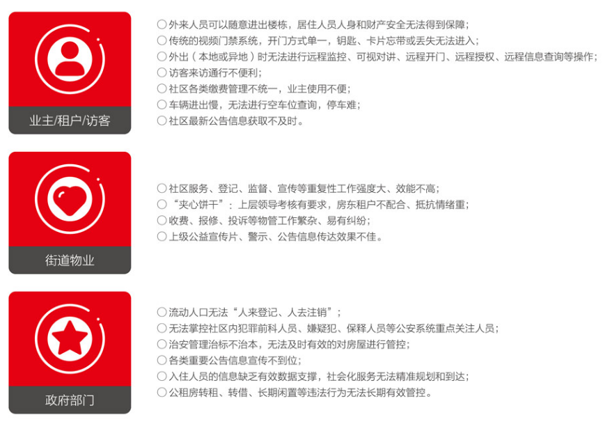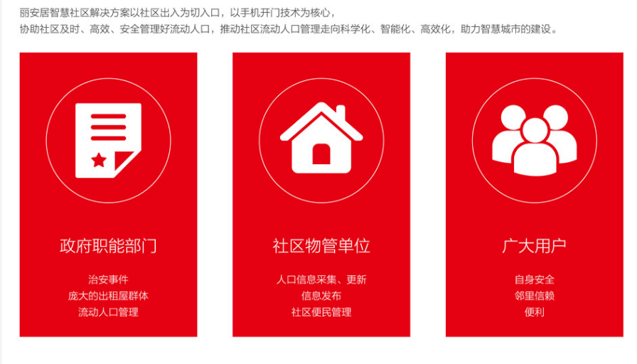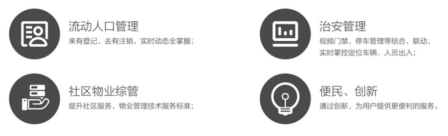 全面掌控流动人口信息、大限度预防或降低治安事件;提升街道社区物业综合管理和服务标准;通过创新为用户和管理者提供大的便利。