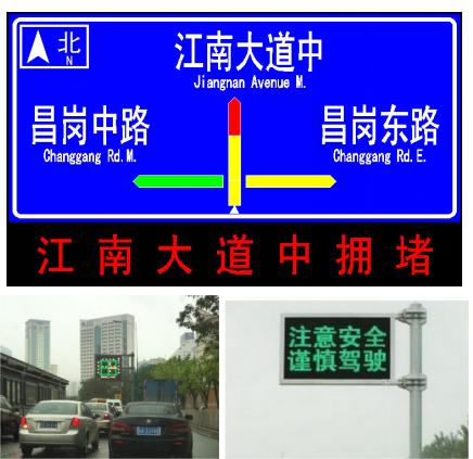 通用信息发布:能显示通用的交通信息,如交通法规、宣传标语等,根据设定好的显示时间,多条信息轮流播放。信息内容、显示时间可通过系统更改。