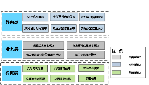 业务层:系统按业务,分为实时路况发布模块、突发事件信息发布模块、卡口等系统设备位置展示模块,施工信息展示模块等四个模块。