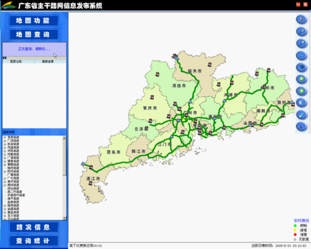 实现市区实时拥堵路况查询功能,在实时拥堵路况地图上通过红、黄、绿三种高亮颜色分别代表拥堵、缓慢、畅通三种交通路况,直观地显示实时路况信息。