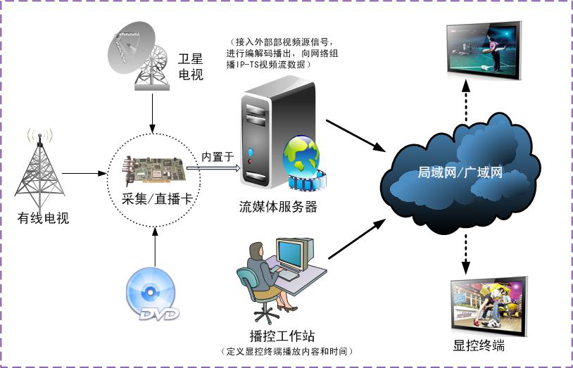 通过建立流媒体服务器和视频采集设备可接入有线电视/卫星电视/DVD/摄像机等直播视频进行转播,通过网络将实时直播信号发送到指定区域进行播放,并支持组合播放,即将视频信号、静动态图片、文字、声音结合成一个画面进行播放;